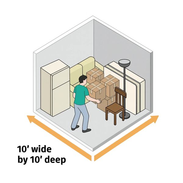 A 10' x 10' storage unit, priced at $90 per month, is just slightly smaller than an average spare bedroom. It typically accommodates the contents of an entire family room or two full bedrooms, including several small- to medium-sized boxes, furniture, and household items.
